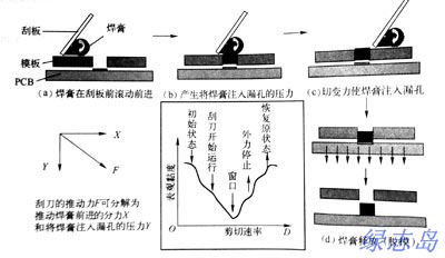 當(dāng)刮刀以一定速度和角度向前移動時(shí),對焊錫膏產(chǎn)生一定的壓力,推動焊錫膏在刮板前滾動,產(chǎn)生將焊錫膏注入網(wǎng)孔(即模板開口)所需的壓力,焊錫膏的粘性摩擦力使焊錫膏在刮板與網(wǎng)板交接出產(chǎn)生切變,切變力使焊錫膏的粘性下降,從而順利地注入網(wǎng)孔;當(dāng)刮板離開模板開口時(shí),焊錫膏的粘度迅速回復(fù)到原始狀態(tài)。下圖為焊錫膏印刷原理示意圖: