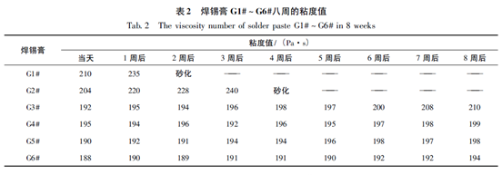 焊錫膏G1# ~ G6#每周一次的粘度值如表2 所示,從表2 看出G1#、G2#焊錫膏的初始粘度較G3# ~ G6#高,G1#兩周后砂化,G2#四周后砂化,G3# ~ G6#在八周內的粘度保持穩定。